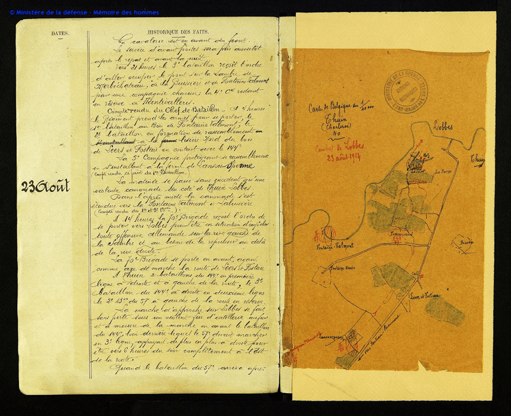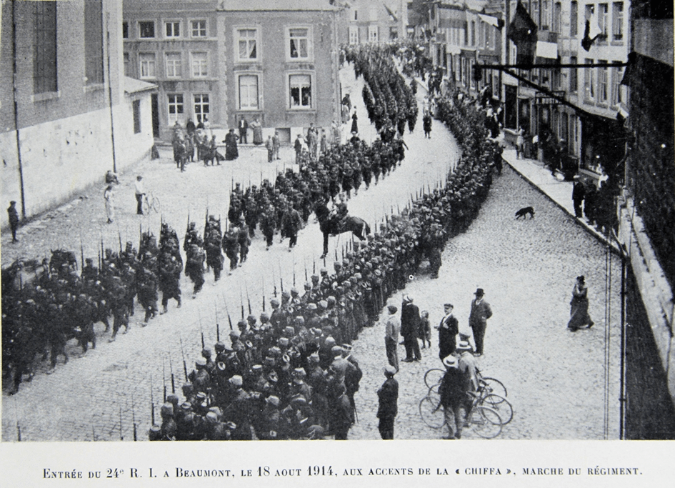 La journée du 23 marquera le départ des troupes en direction de Lobbes afin d’empêcher l’ennemi de franchir la Sambre. Après de vaillants combats menés entre autres par le 57 e RI et le 144 e Ri, la plupart des Régiments durent battre en retraite et se replier sur la Marne.
