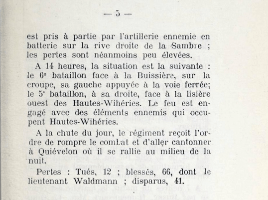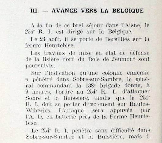 - Le 254e Régiment d’Infanterie, à 9 heures du matin et sur indication qu’une colonne ennemie a pénétré dans Solre-sur-Sambre, reçoit l’ordre d’attaquer à Solre et à Labuissière. Le feu est également engagé à Hantes-Wihéries. A l’issue de cette journée, le Régiment relèvera 12 tués, 66 blessés et 41 disparus. Le centre du village et le quartier de l’église furent fortement endommagés.