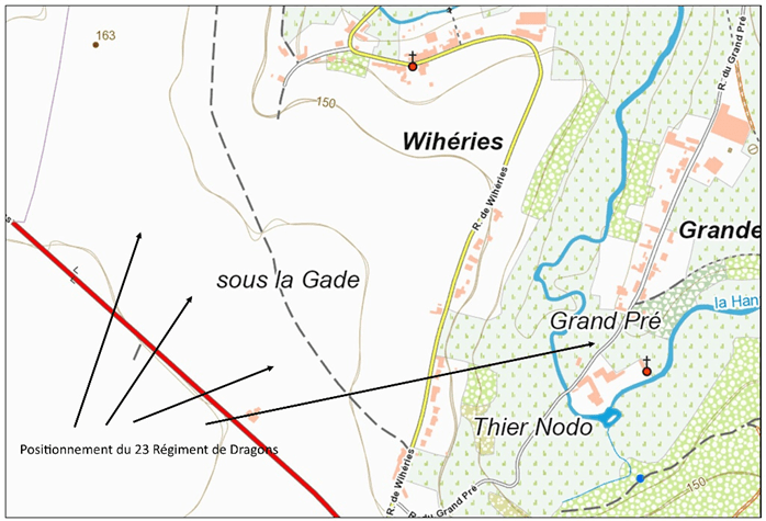 On place l’artillerie sur les hauteurs du hameau de Wihéries au lieu- dit « Maréchal de la Gade » sur la route Mons à Beaumont. Un détachement du 23e Dragons doit organiser la défense ; la nuit se passe angoissante ; heureusement l’ennemi ne vient pas.