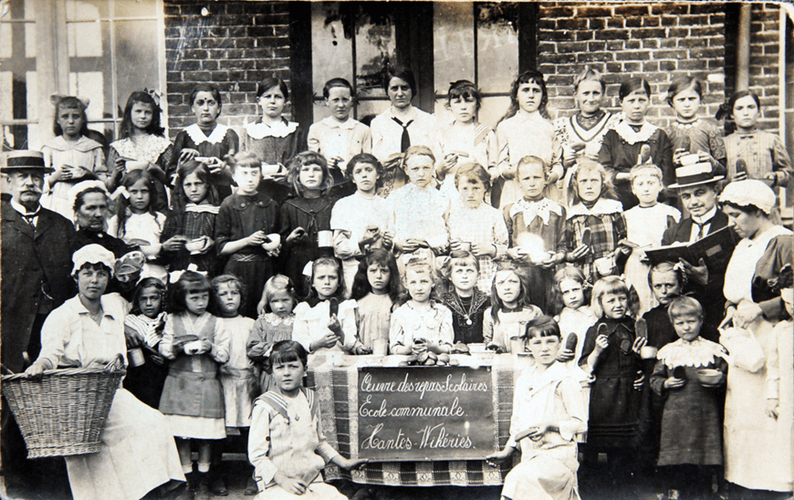 3 Août – Ce soir, on nous annonce que les troupes allemandes déferlent sur la Ville de Liège. La Belgique et l’Angleterre entrent en lice à leur tour. En attendant l’arrivée des Anglais, les trains transportant des soldats français arrivent au secours de la frontière violée. Dans la soirée, nos élèves françaises vont saluer leurs compatriotes à Solre-sur-Sambre. Au village, les femmes sanglotent …