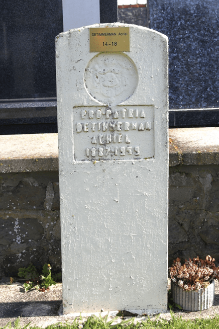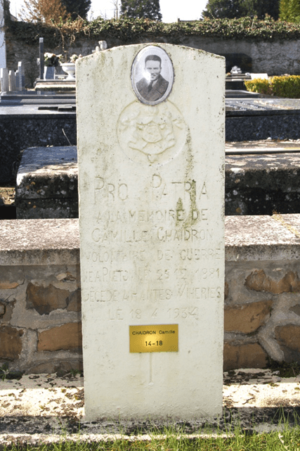 Note : A la mémoire de Camille Chaidron volontaire de guerre Né à Pieton le 25/12/1881 Décédé à Hantes Wiheries le 18/04/1934.