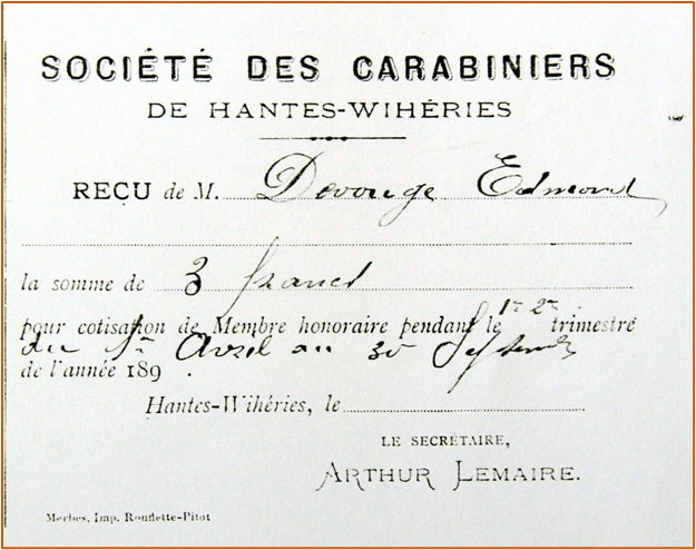C’est le 14 décembre 1881 qu’eu lieu la première réunion de la commission d’une société de tir au fusil à Hantes-Wihéries. Cette commission comprenait les personnes ci-après : Lambert Delfosse Président, E. Laurent Secrétaire, César Riche (brasseur), Jules Vainqueur, Adolphe Renaux, P. Fayt, membres.