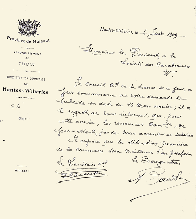En 1909, le nombre de membres diminuant, la société commençait à faire face à des problèmes de trésorerie. Elle fit alors une demande de subsides auprès des autorités communales, malheureusement la commune ne put les satisfaire.
