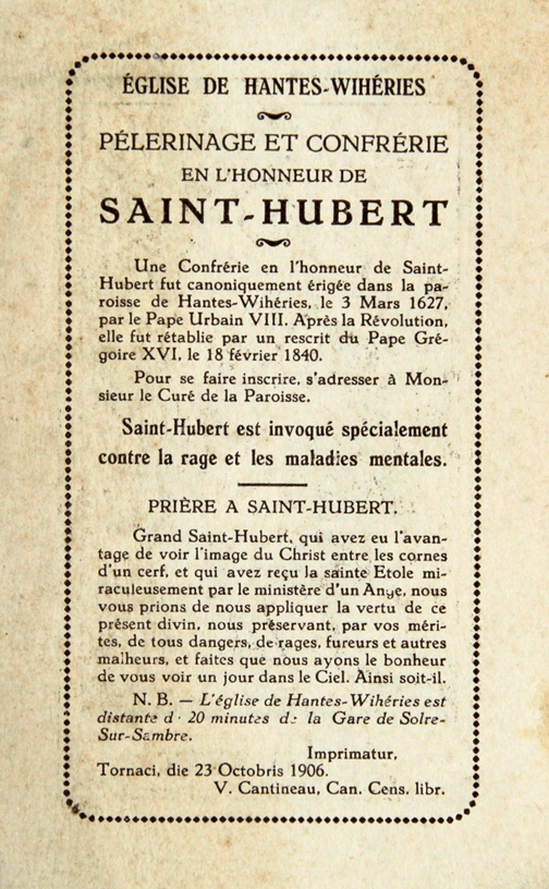 A Hantes, le pèlerinage de la Saint-Hubert remportait chaque année un grand succès tant auprès des paroissiens que des personnes des villages voisins. Après le départ tant regretté du curé Baudson en 1969, ce pèlerinage se retira petit à petit de la vie paroissiale. Je me souviens, étant jeune, des très nombreuses personnes qui commandaient les fameuses « couques » à l’excellente boulangerie de Jeanine et Marcel Remacly afin de les faire bénir le jour de la Saint-Hubert pour ensuite les consommer et les distribuer aux animaux pour les protéger des maladies. La fête de Saint-Hubert a lieu le 3 novembre mais les festivités étaient parfois décalées au dimanche qui suivait.
