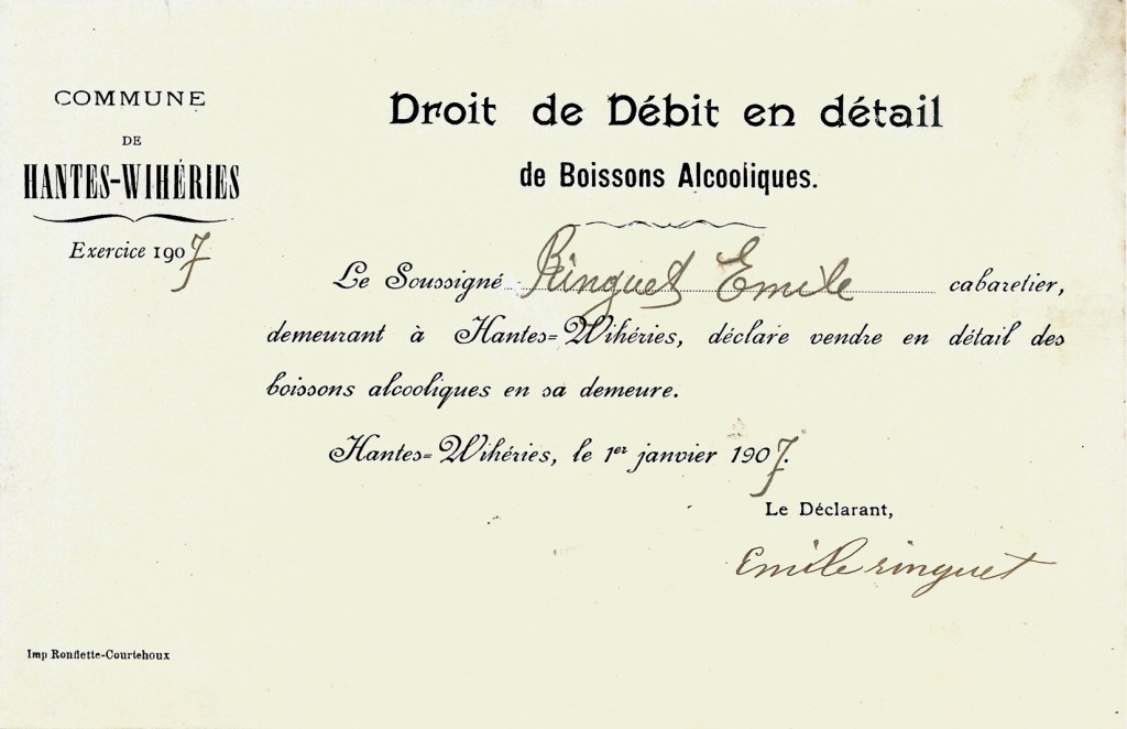 Emile Ringuet, en plus d’être ouvrier brasseur, payait une patente et vendait des boissons alcooliques en sa demeure à la rue du Calvaire.