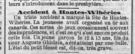 Pour la fête communale de juillet 1914, le Conseil communal décide d’inviter la fanfare « La Concorde » de La Buissière, et de recevoir cette société, les deux sociétés musicales de la commune et la société des carabiniers hantois à la maison communale ; un verre de champagne sera offert à ces Sociétés.
