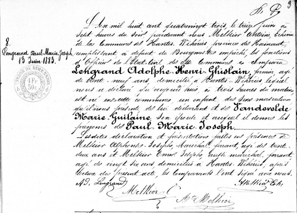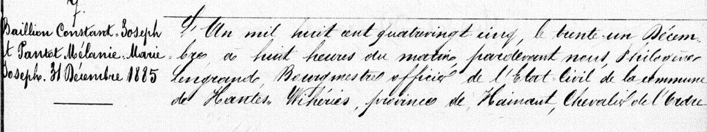L’an mille huit cent trente sept le treize avril à une heure de relevée (1 heure de l’après-midi) par devant nous Philogène Lengrand Bourgmestre et Officier de l’état civil de la commune de Hantes-Wihéries Canton de Merbes le Château province de Hainaut sont comparus