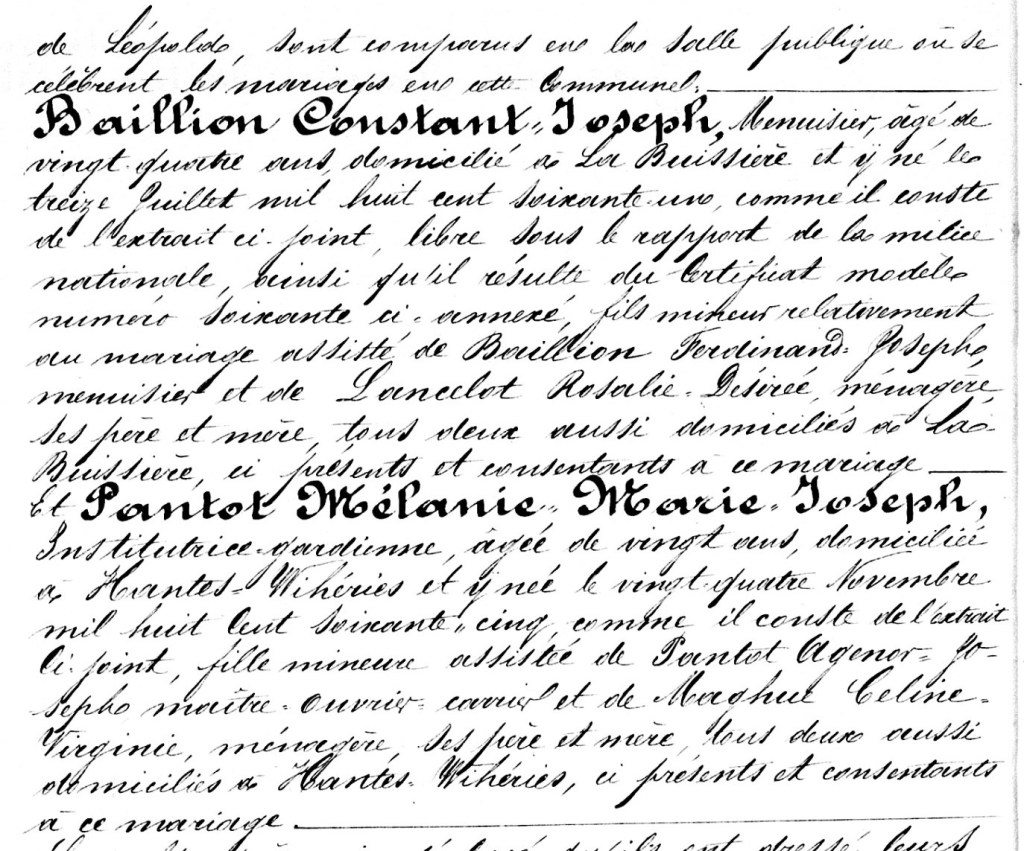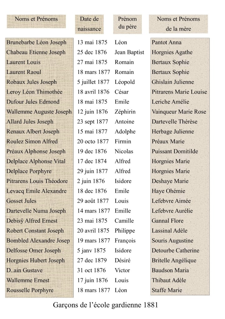 Ayant procédé par un scrutin secret à la nomination dont il s’agit, le Conseil décida de nommer Porphyre Fayt, élève diplômé de l’école normale de Bonne-Espérance et actuellement sous-instituteur à Solre-sur-Sambre. Il obtint 7 suffrages sur 7 votants. Porphyre Fayt est originaire du village, né le 6 juin 1855, fils de Désiré, contremaitre de carrières, et Charlotte Dartevelle.