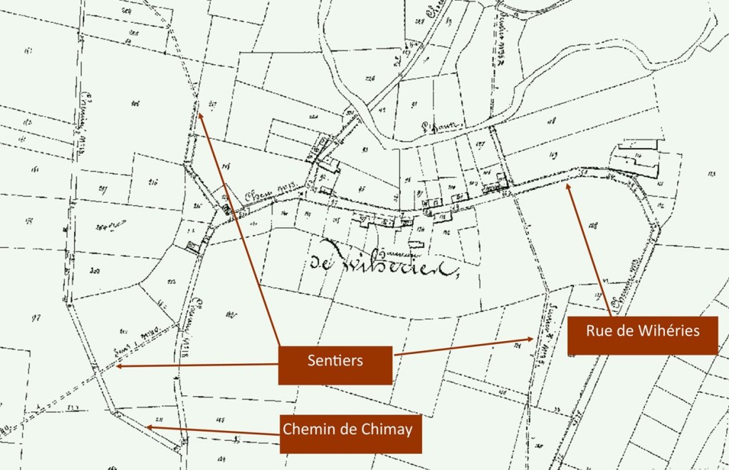 Les chemins du village sont à cette époque constitués de terres battues et de pierrailles. Seuls deux chemins reconnus de grande communication existent entre Solre- sur- Sambre et Fontaine Valmont d’une part et entre le Calvaire et la frontière française d’autre part ; c’est-à-dire passant par le jeu de balle et la rue de Wihéries.