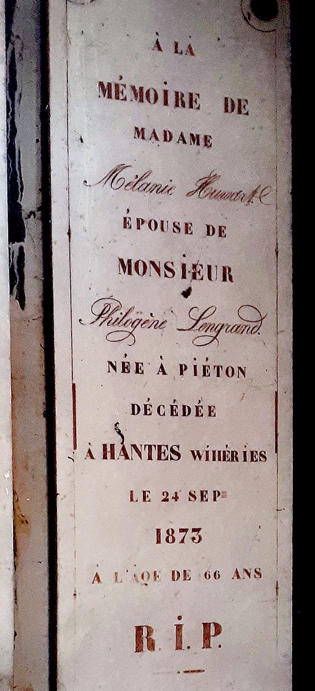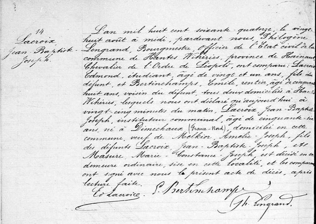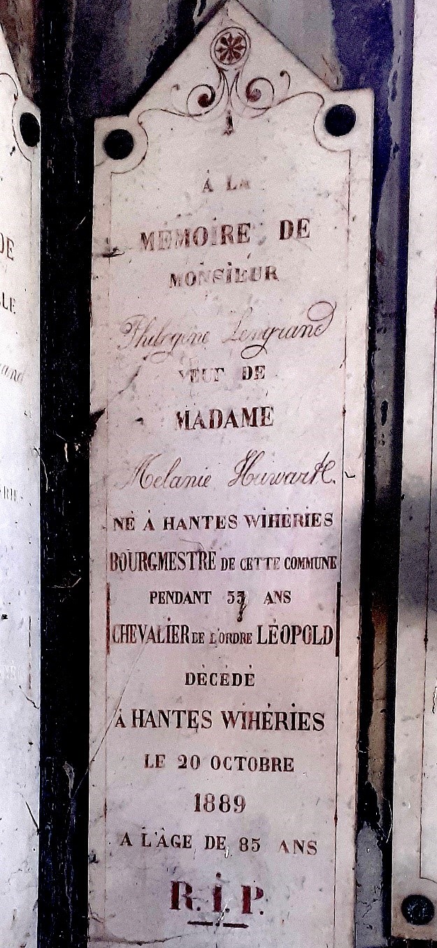 « A la mémoire de Jean-Baptiste Lacroix, instituteur, secrétaire communal, clerc laïc de Hantes-Wihéries, décédé le 28 août 1874 à l’âge de 56 ans, administré des sacrements, de son épouse Amélie Joseph Melkior, décédée le 16 juillet 1874 à l’âge de 50 ans, administrée des sacrements et de leur fille Anna Joseph Lacroix décédée le 29 août 1851 à l’âge de 3 ans et 9 mois. »