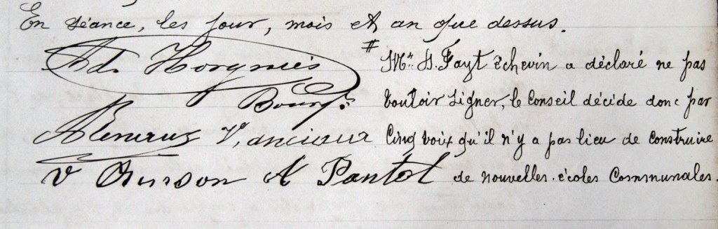 Ces demandes étant accompagnées des pièces officielles, le Conseil procéda par bulletins secrets à la nomination d’un instituteur communal primaire. Il en résulta que par sept voix sur sept votants, Mr François Deskoeuvre fut nommé instituteur primaire au traitement annuel de 1200 francs plus le logement et le chauffage. Il prendra possession de son emploi le 1er avril.