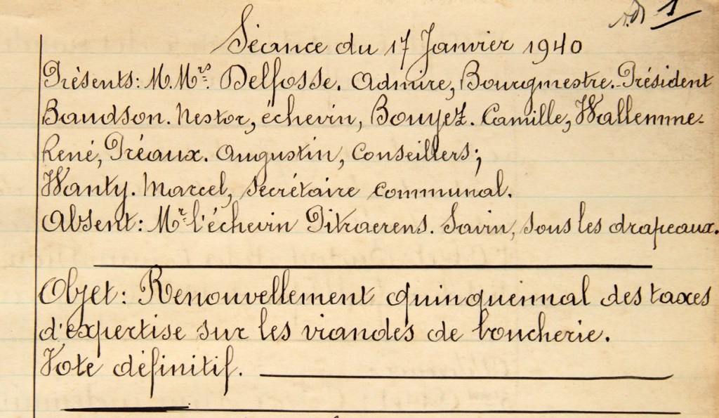 Le garde-champêtre sera chargé de recevoir chez les habitants pour effectuer le paiement des frais nécessités par la fête de juillet et celle d’octobre 1914. Une commission de fêtes pour l’organisation des décisions prises ci-dessus est composée de Mr l’Echevin Armand Brunebarbe et de Mr le Conseiller Raymond Laurent. Mr le Bourgmestre se réservant ses droits de police pour 1914.