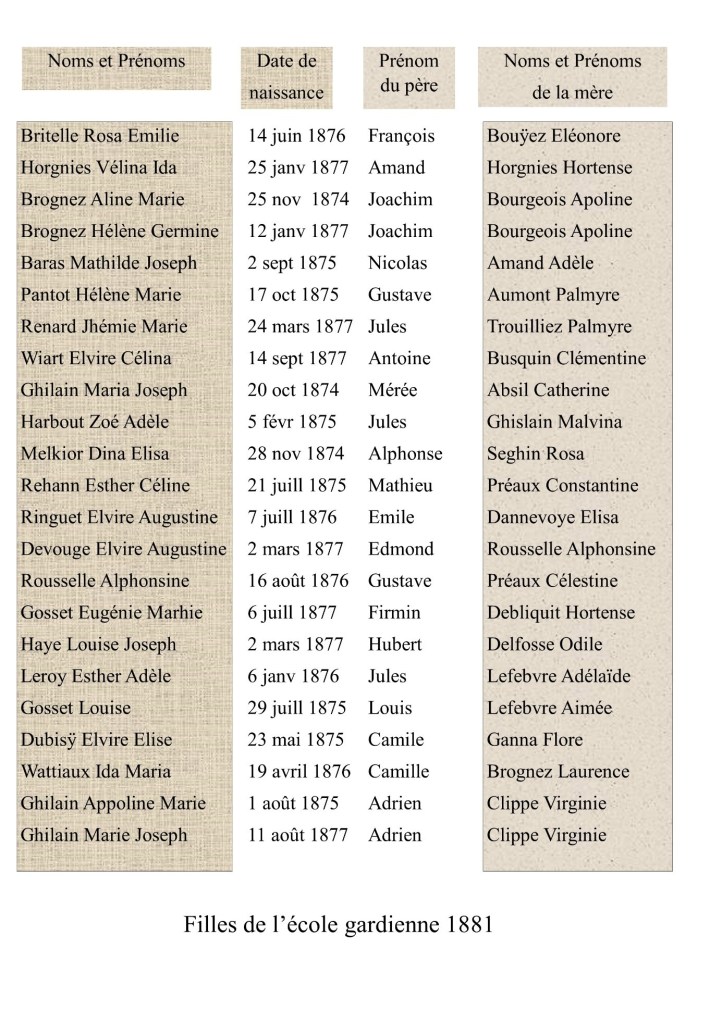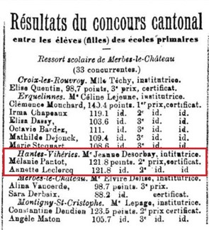 La nomination de la nouvelle institutrice en remplacement de Mme André Dautez, institutrice provisoire depuis 6 mois, eu lieu le 29 décembre. C’est par 6 bulletins contre un que Mlle Louise Claux fut nommée au traitement de 700 francs par an.