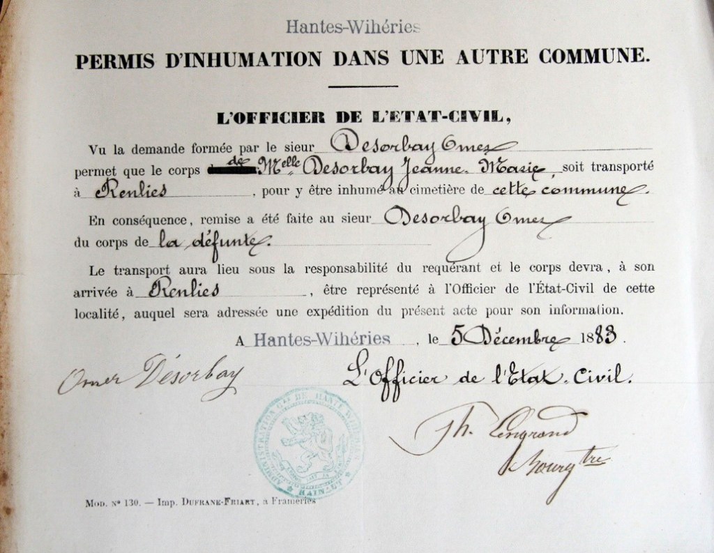 domiciliés au dit-lieu lesquels nous ont déclaré que le même jour à huit heures du matin que Jules Lebeau profession instituteur âgé de dix neuf ans dix mois né et domicilié à Hantes-Wihéries, fils d’Alexandre Lebeau, Clerc, et Dusmarine Hannequart ménagère, domiciliés au dit-lieu, est décédé en la maison de son père au dit Hantes-Wihéries. Ont les déclarants signé avec nous le présent acte de décès après leur en avoir donné lecture.