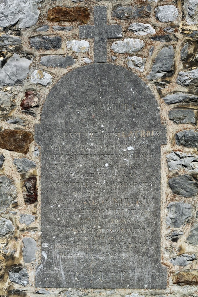 Parmi les nombreuses pierres tombales insérées dans les murs de l’église, on peut observer celle de Jean-Baptiste Lacroix avec l’épitaphe suivante :