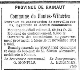 Dans le moniteur du Hainaut du 28 avril 1837 et pour pourvoir à son remplacement, parait un article mentionnant que la place d’instituteur est vacante à Hantes-Wihéries et que tout individu qui désirerait obtenir cette place, doit s’adresser chez le bourgmestre de l’endroit pour connaitre les conditions.