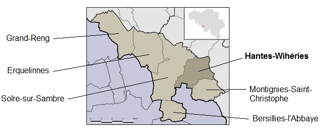 Hantes-Wihéries est un petit village wallon au cœur de la haute Sambre dans la province du Hainaut. Il se trouve le long de la frontière française à 28 km au sud-ouest de Charleroi et à 25 km au sud-est de Mons. Lors de la fusion des communes en 1977, la localité a été rattachée à la commune d’Erquelinnes, avec les villages de Solre-sur-Sambre, Montignies-Saint-Christophe, Bersillies-l ’Abbaye et Grand-Reng.